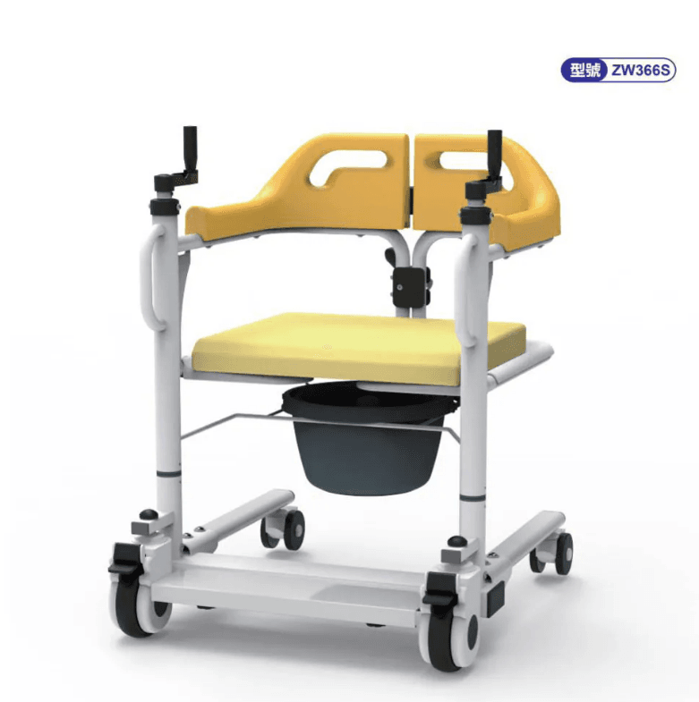 左右邊的手搖升降同步20公分高度, 方便受照顧者上下椅,也節省照顧者的體力。