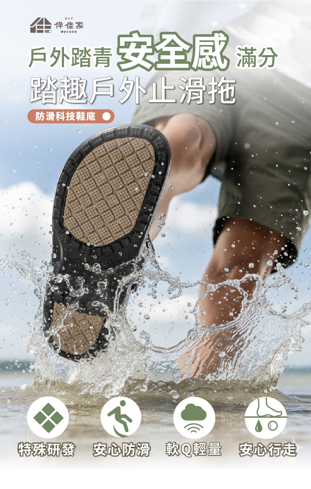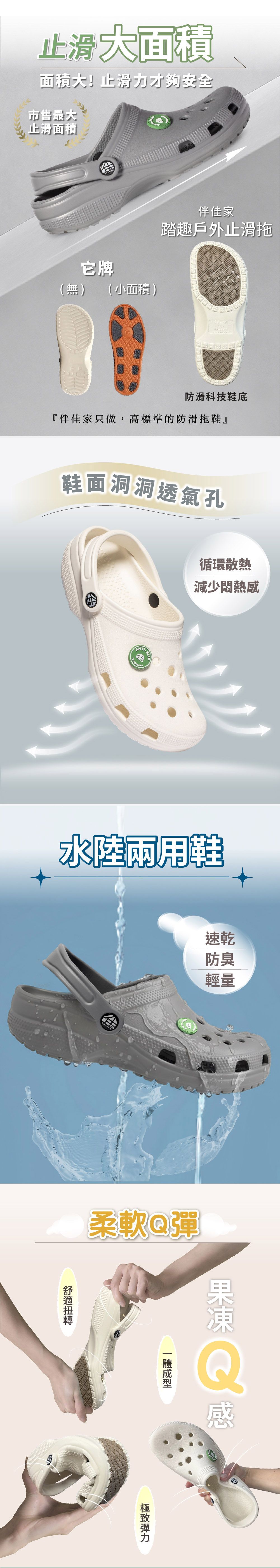 【伴佳家】踏趣戶外止滑鞋,就是為了給長輩全方位的足部守護。它採用高彈EVA材質,極致輕量,行走舒適無負擔。「特殊貼片鞋底」搭配「足底顆粒」,提供強大的抓地力與摩擦力,讓雨天行走更穩定。安全包頭設計能包覆腳趾,有效抵擋戶外碰撞。可調式後跟更能自由切換成拖鞋或涼鞋模式,加上沖水即淨的快乾特性,無論是居家、外出、露營或海邊,都是長輩最安心可靠的防滑首選。